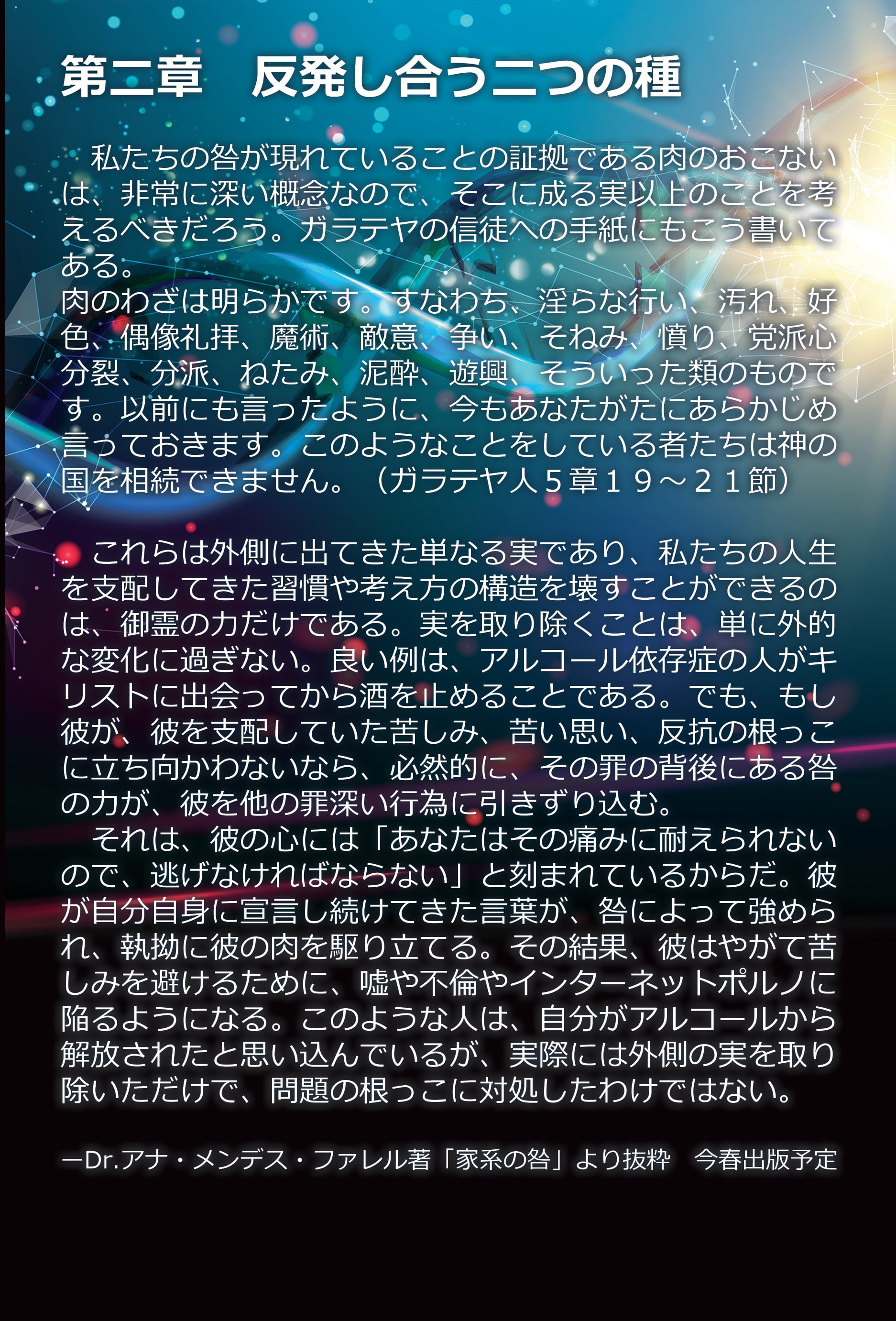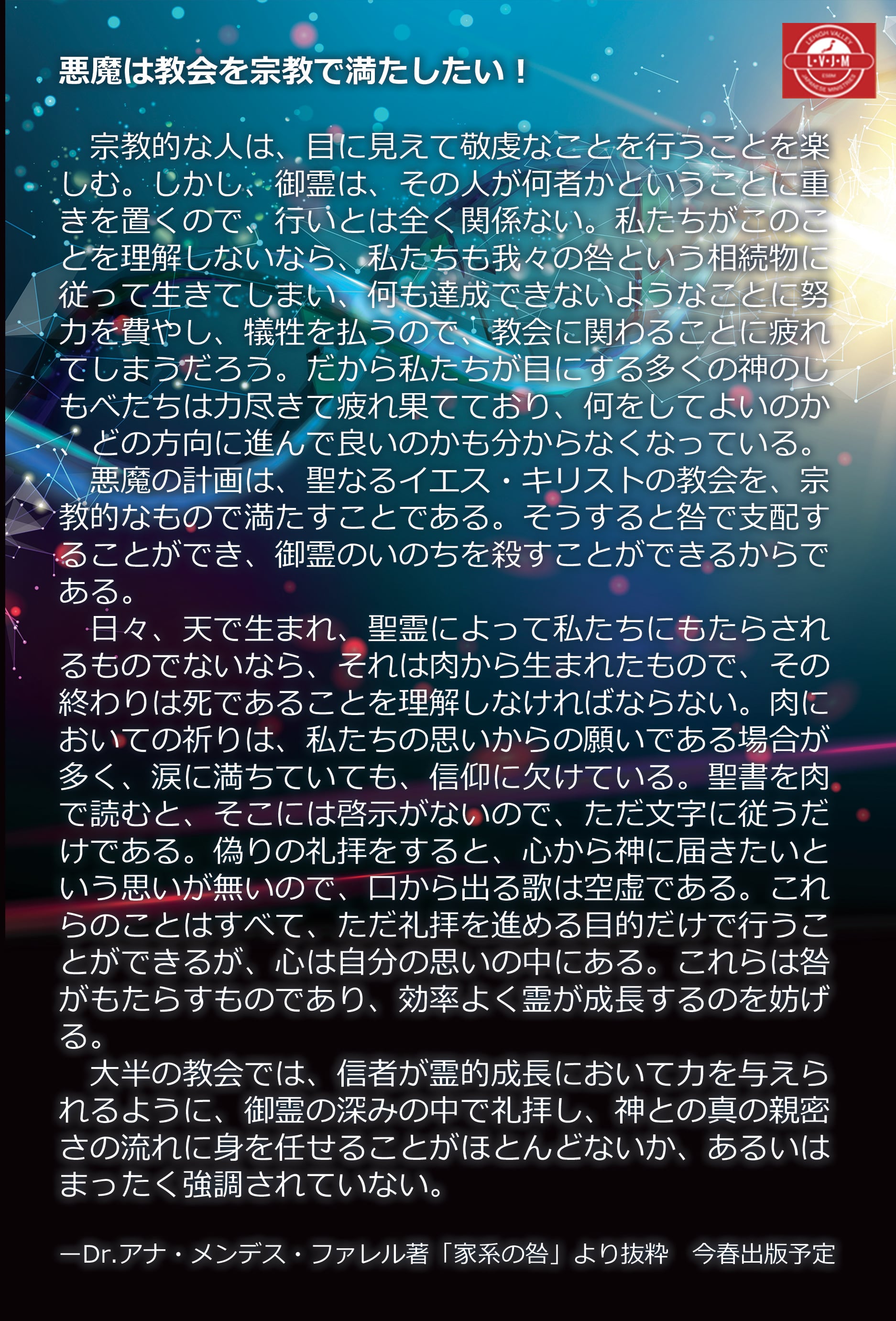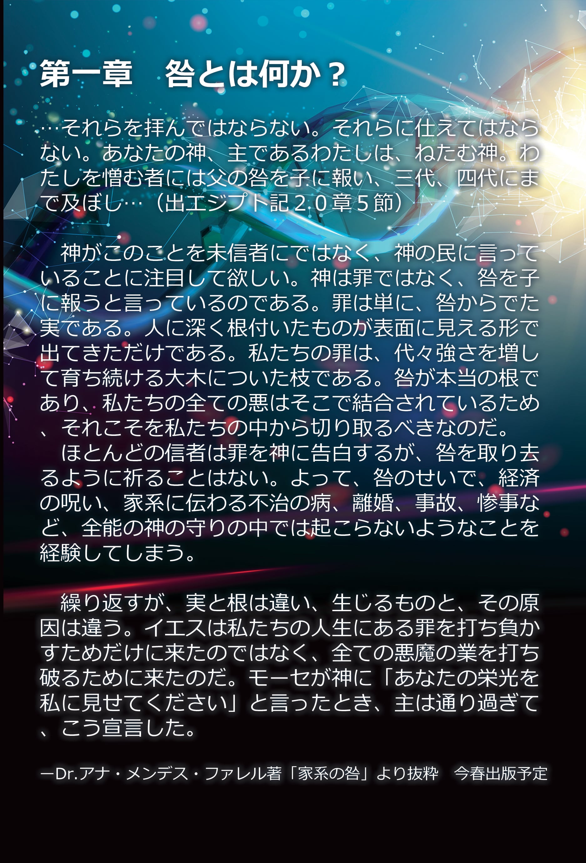 Dr. アナ・メンデス・フェレルが解放の領域で受けた啓示と、深い調査に基づいて書かれた本書は、神があなたに用意しておられる運命に到達するために、すべての人が読むべきベストセラーである。どう解決してよいかわからない多くの問題の答えを本書は提供する。あなたが咎から自由になるにつれ、神の栄光の中を歩んでいくことを妨げている霊的な負の相続物から、あなたは解放されていくだろう。あなたは人生が変わるような自由と満たし、健康や平和を感じるようになるだろう。