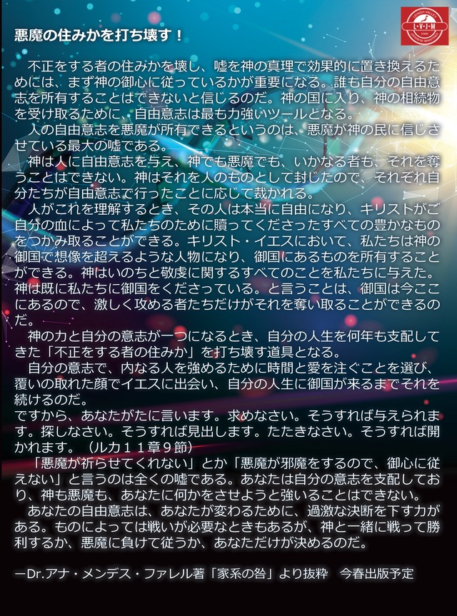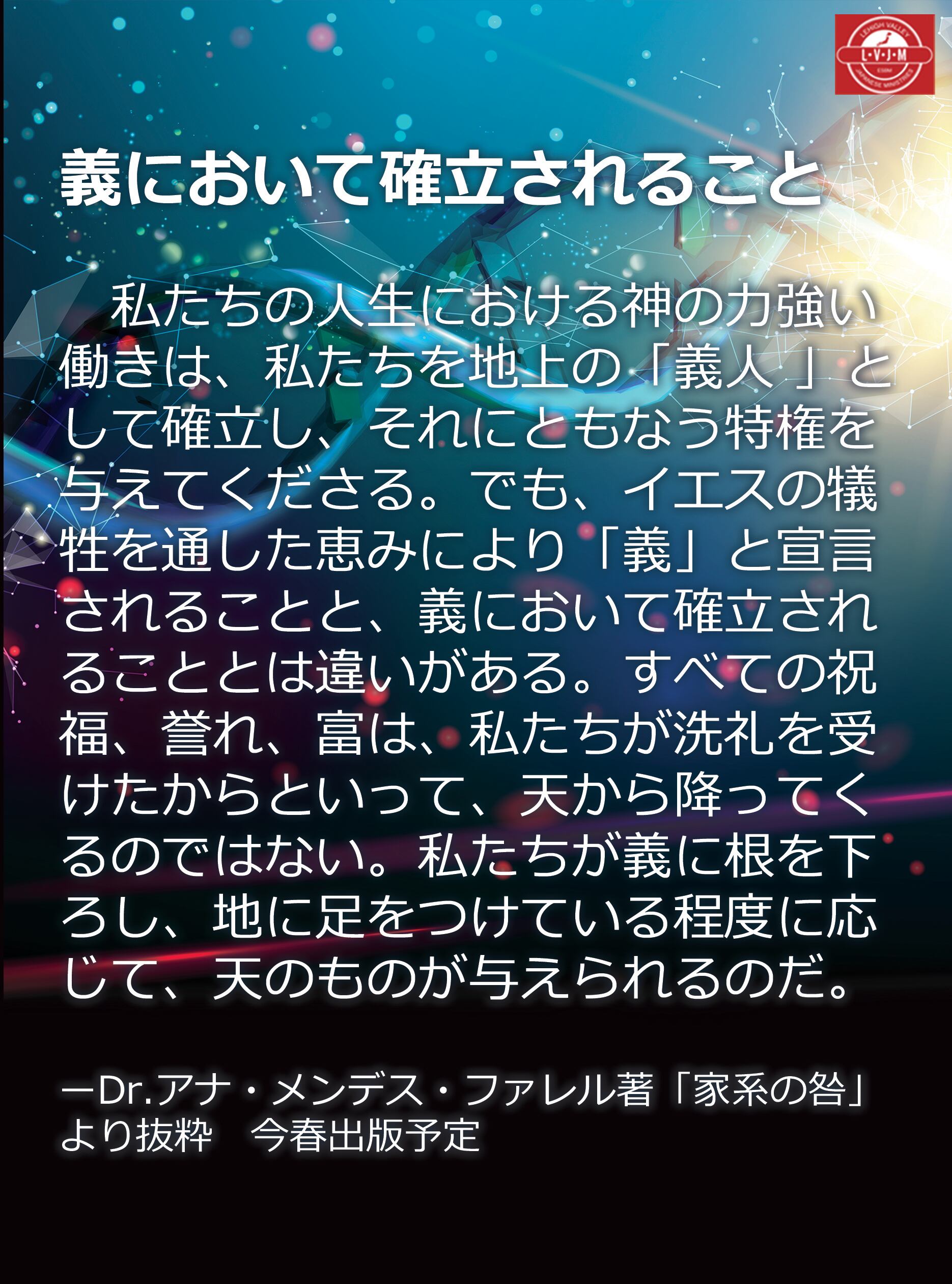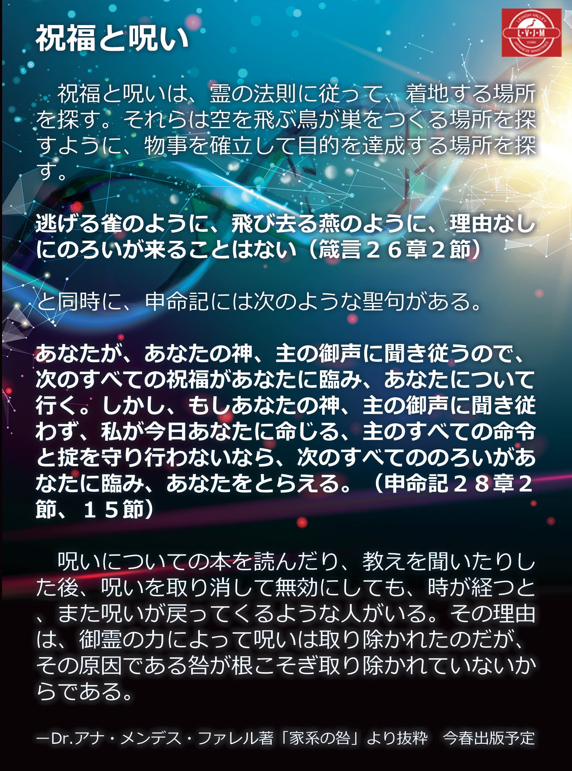 Dr. アナ・メンデス・フェレルが解放の領域で受けた啓示と、深い調査に基づいて書かれた本書は、神があなたに用意しておられる運命に到達するために、すべての人が読むべきベストセラーである。どう解決してよいかわからない多くの問題の答えを本書は提供する。あなたが咎から自由になるにつれ、神の栄光の中を歩んでいくことを妨げている霊的な負の相続物から、あなたは解放されていくだろう。あなたは人生が変わるような自由と満たし、健康や平和を感じるようになるだろう。